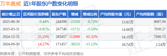 证券之星消息,近日万丰奥威(维权)披露,截至2025年6月30日公司股东户数为24.44万户,较3月31日减少2.33万户,减幅为8.72%。户均持股数量由上期的7930.0股增加至8688.0股,户均持股市值为13.81万元。